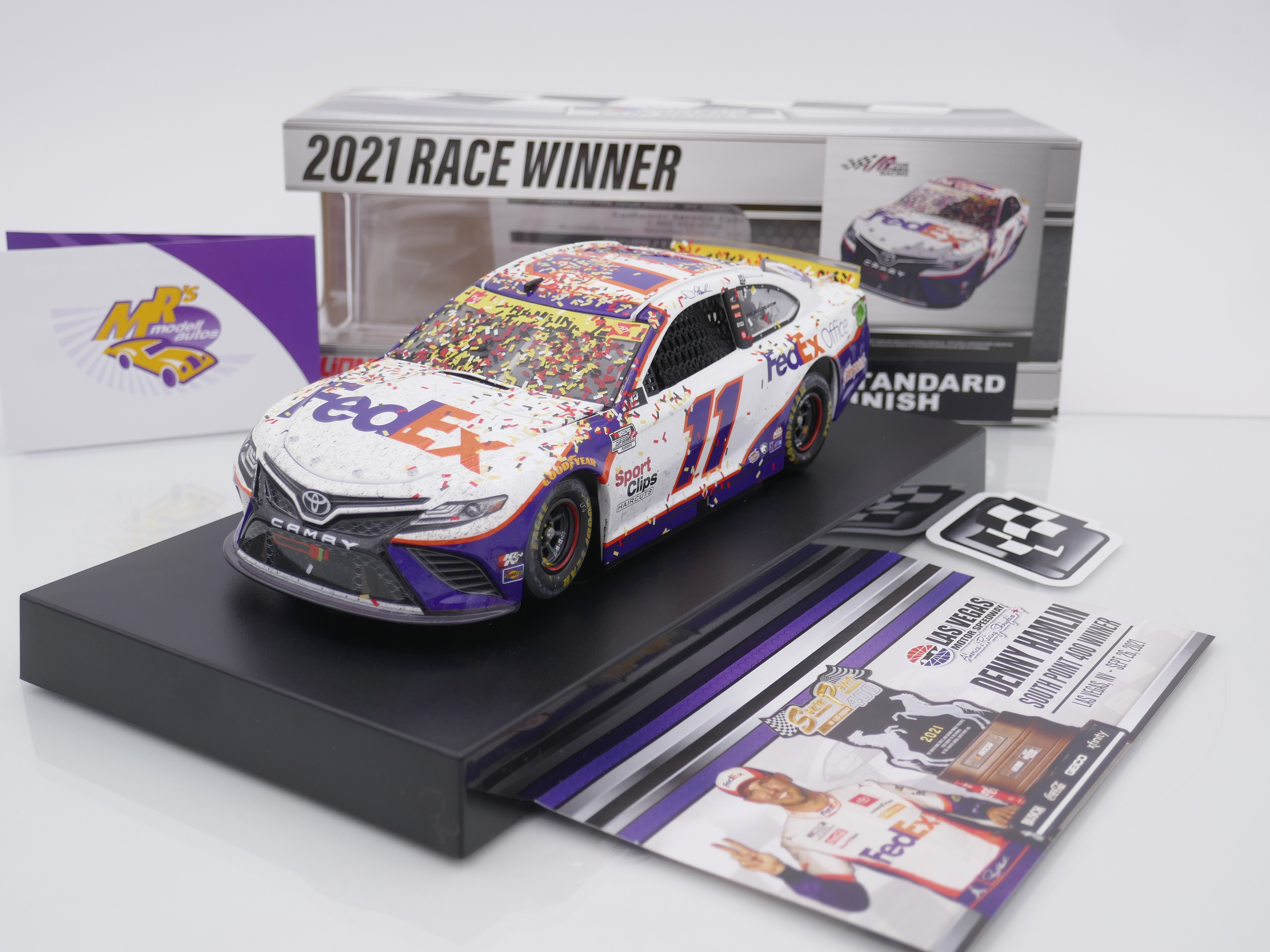 Mobile Preview: Lionel Racing W112123FEXDHC # Toyota Camry NASCAR 2021 " Denny Hamlin - FedEx Office Las Vegas Fall Race Winner " 1:24