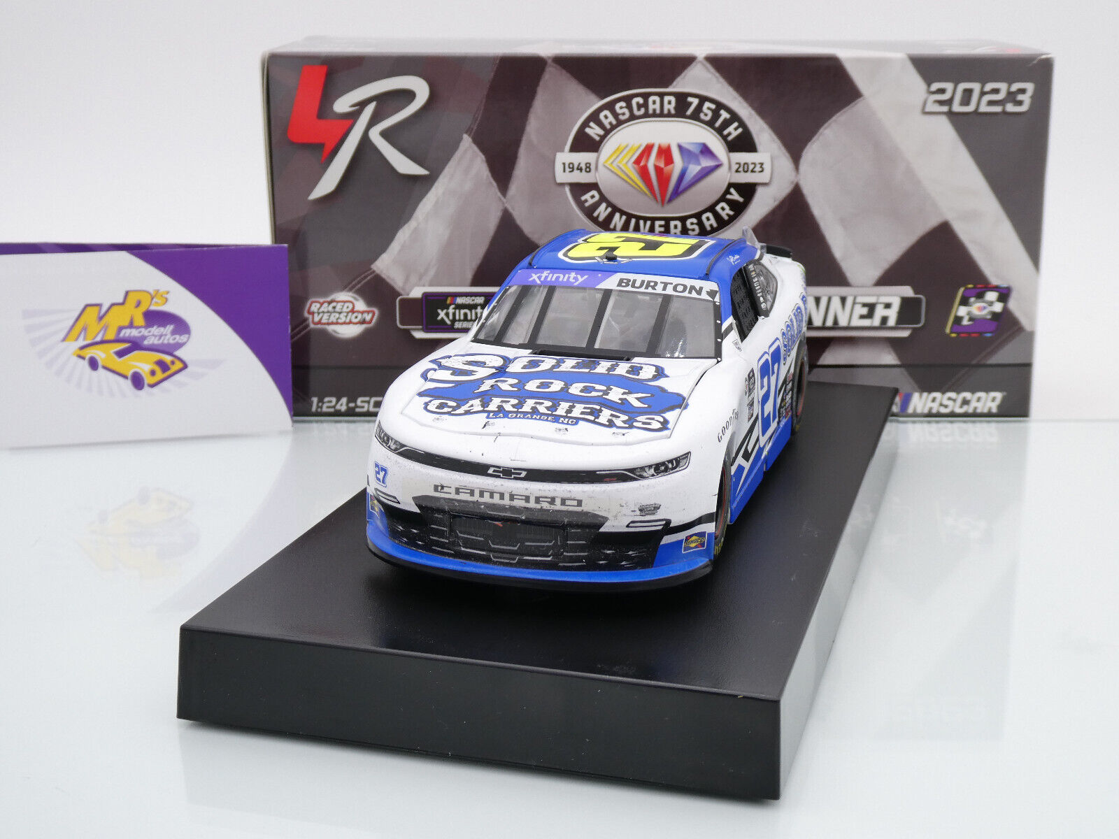Chevrolet Camaro mit Startnummer 27 Talladega Spring Race Winner Xfinity 2023 des Fahrers " Jeb Burton - Solid Rock Carriers " vom Team Jordan Andersen Racing.