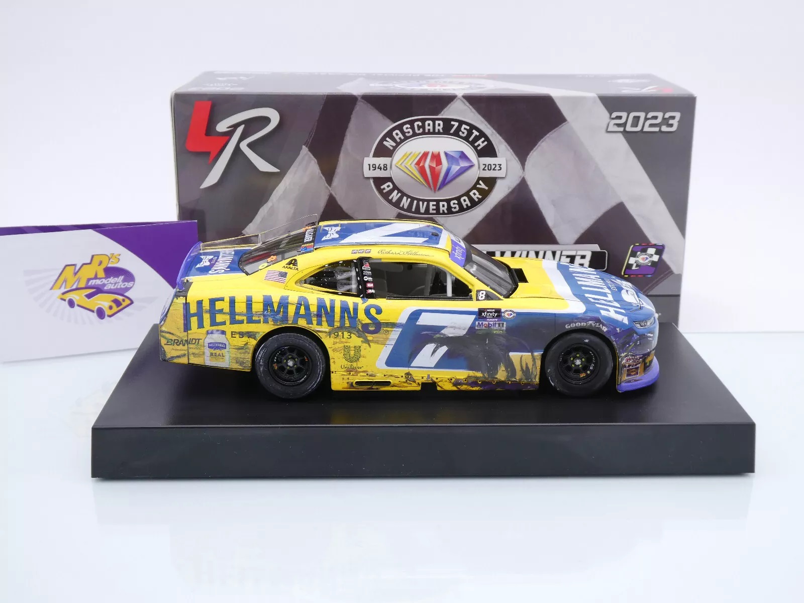 Chevrolet Camaro mit Startnummer 7 Martinsville Fall Race Winner Xfinity 2023 des Fahrers " Justin Allgaier - Hellmann's Real Mayonnaise " vom Team JR Motorsports.