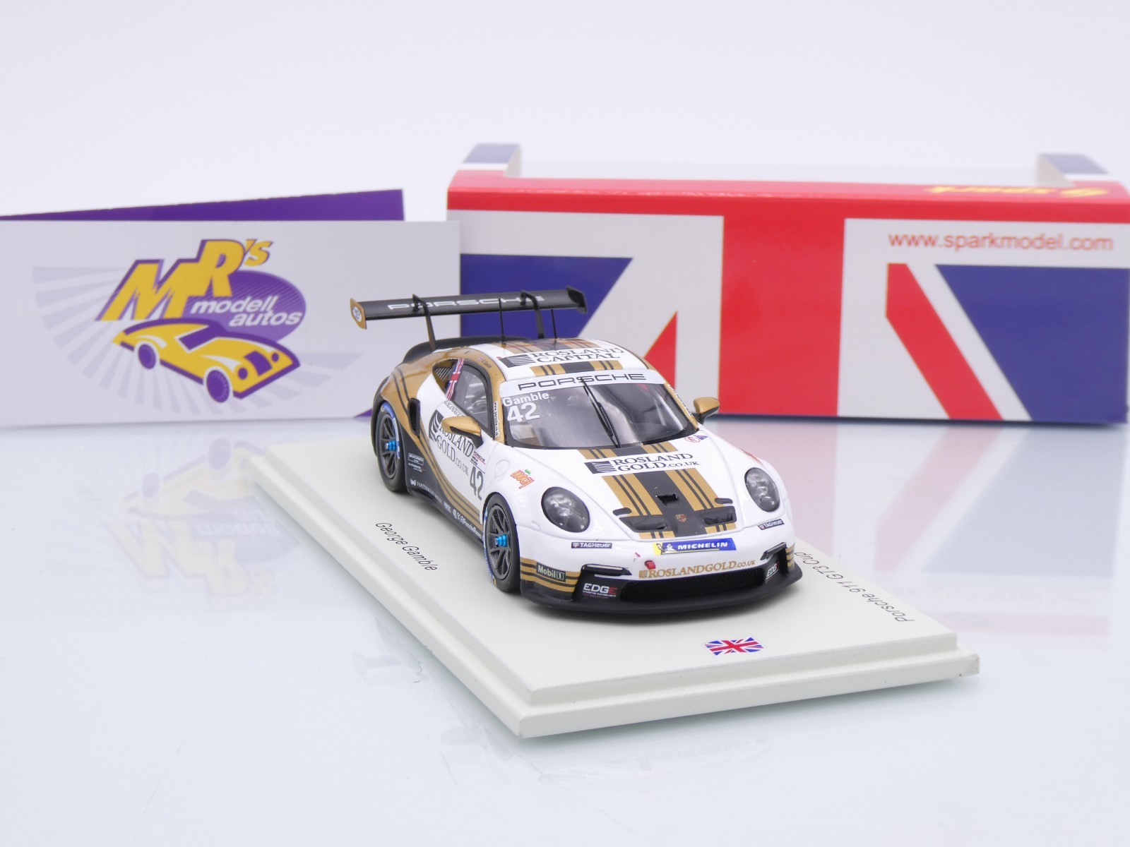 Porsche 911 GT3 Cup Tourenwagen mit Startnummer 42 Champion aus der Porsche Carrera Cup Great Britain Saison 2024 des Fahrers " George Gamble " vom Team Porsche Century Motorsport.